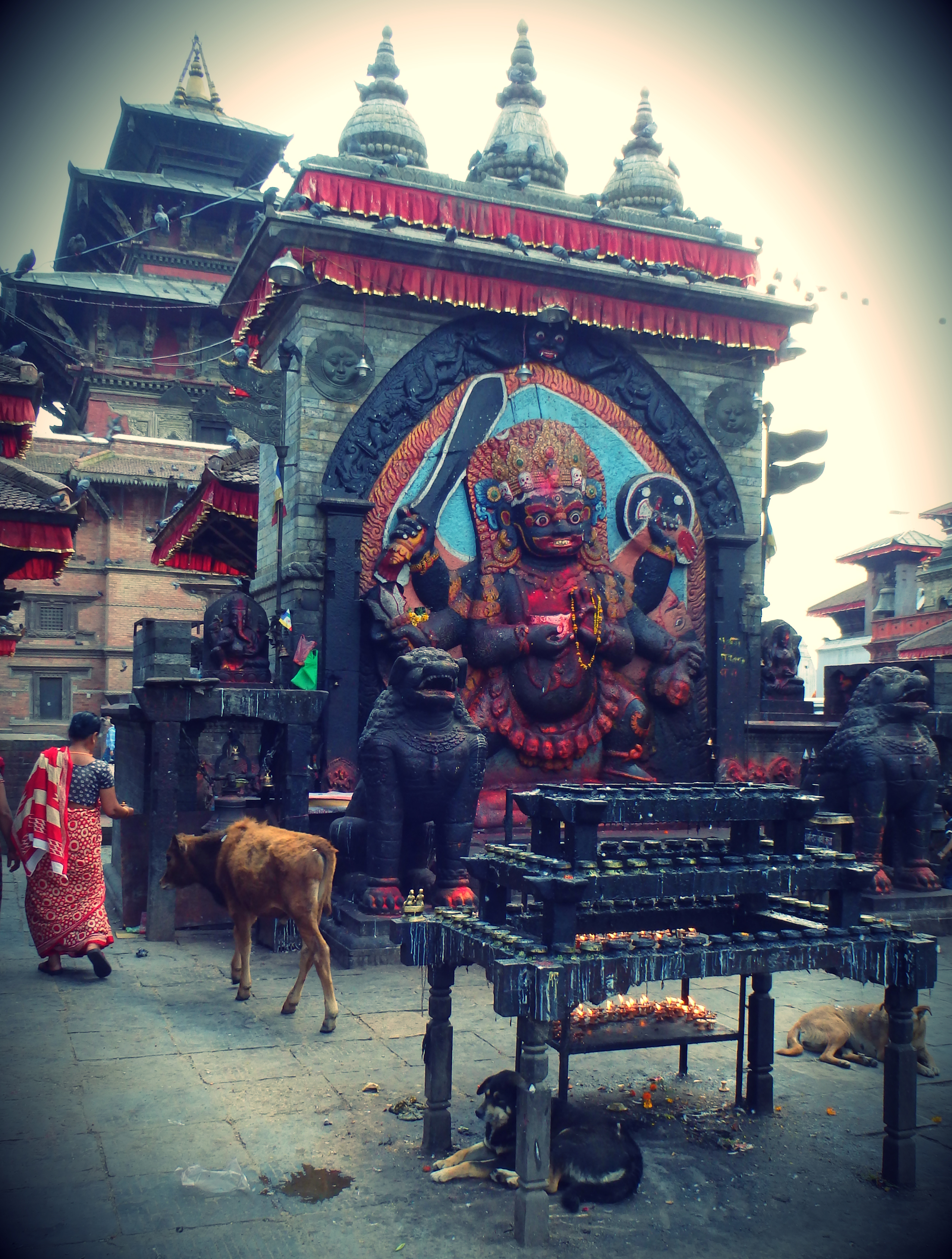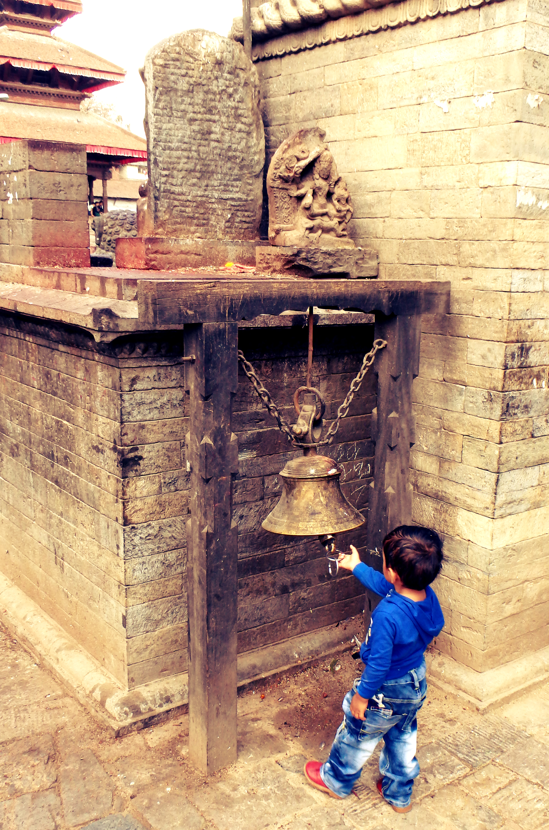Durbar Square was a place were you could cross a calf, tones of pigeons and a few dogs walking randomly around. It was a place were you could see kids playing with a prayer bell or sliding down the stairs.